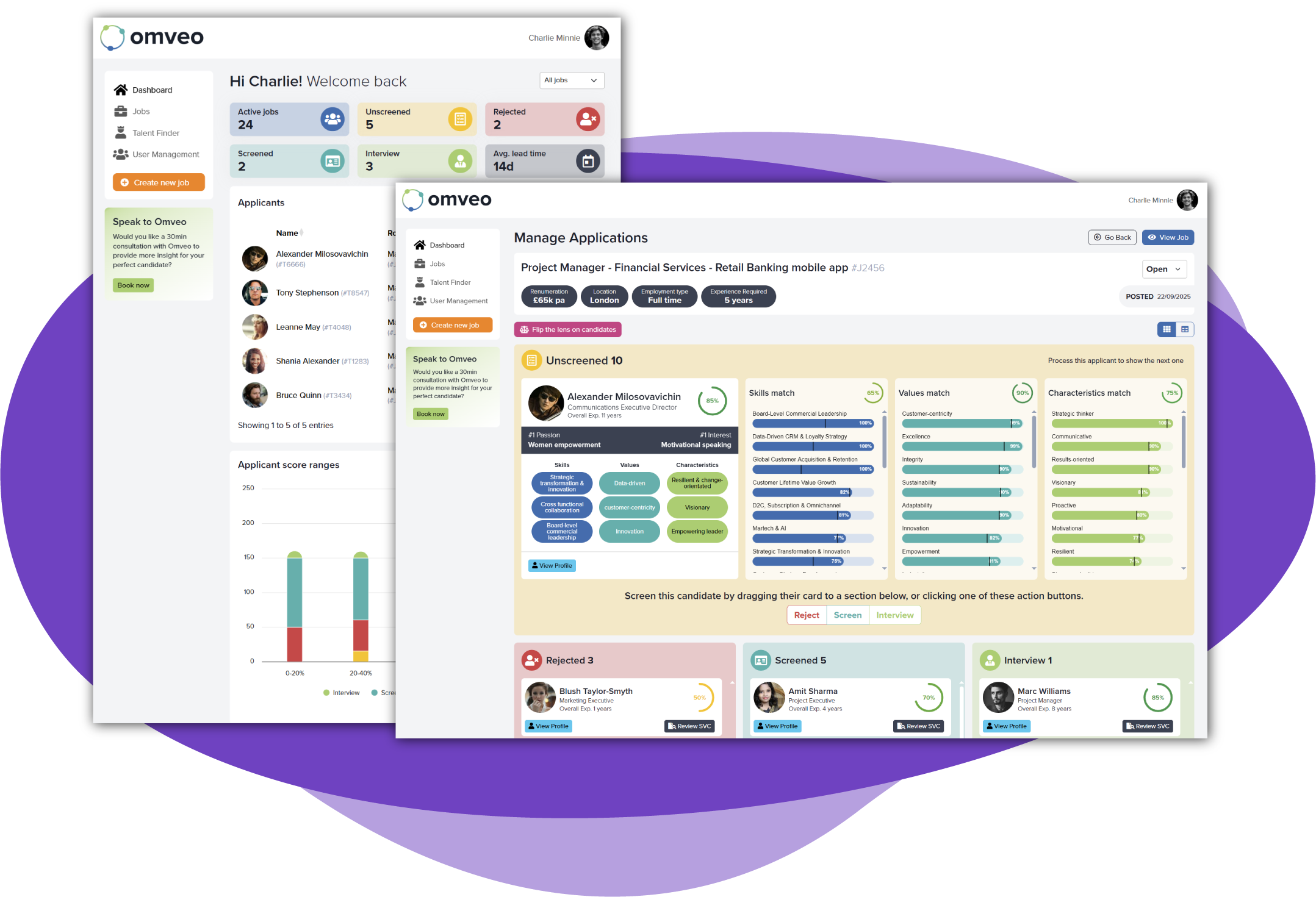 An AI-powered matching system delivers quick insights by scoring candidates based on skills, values, and characteristics